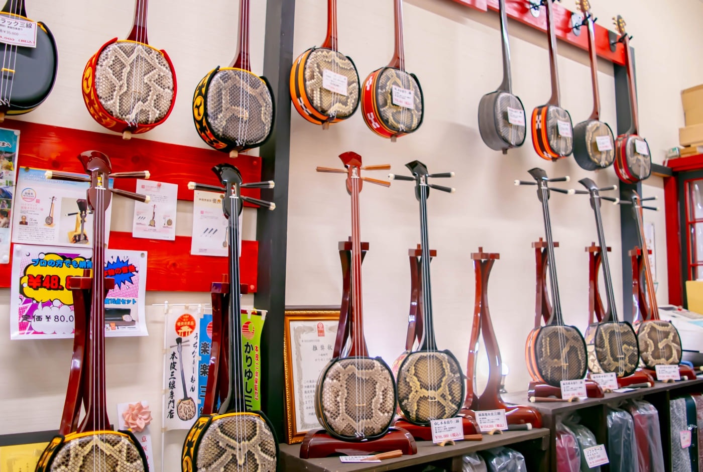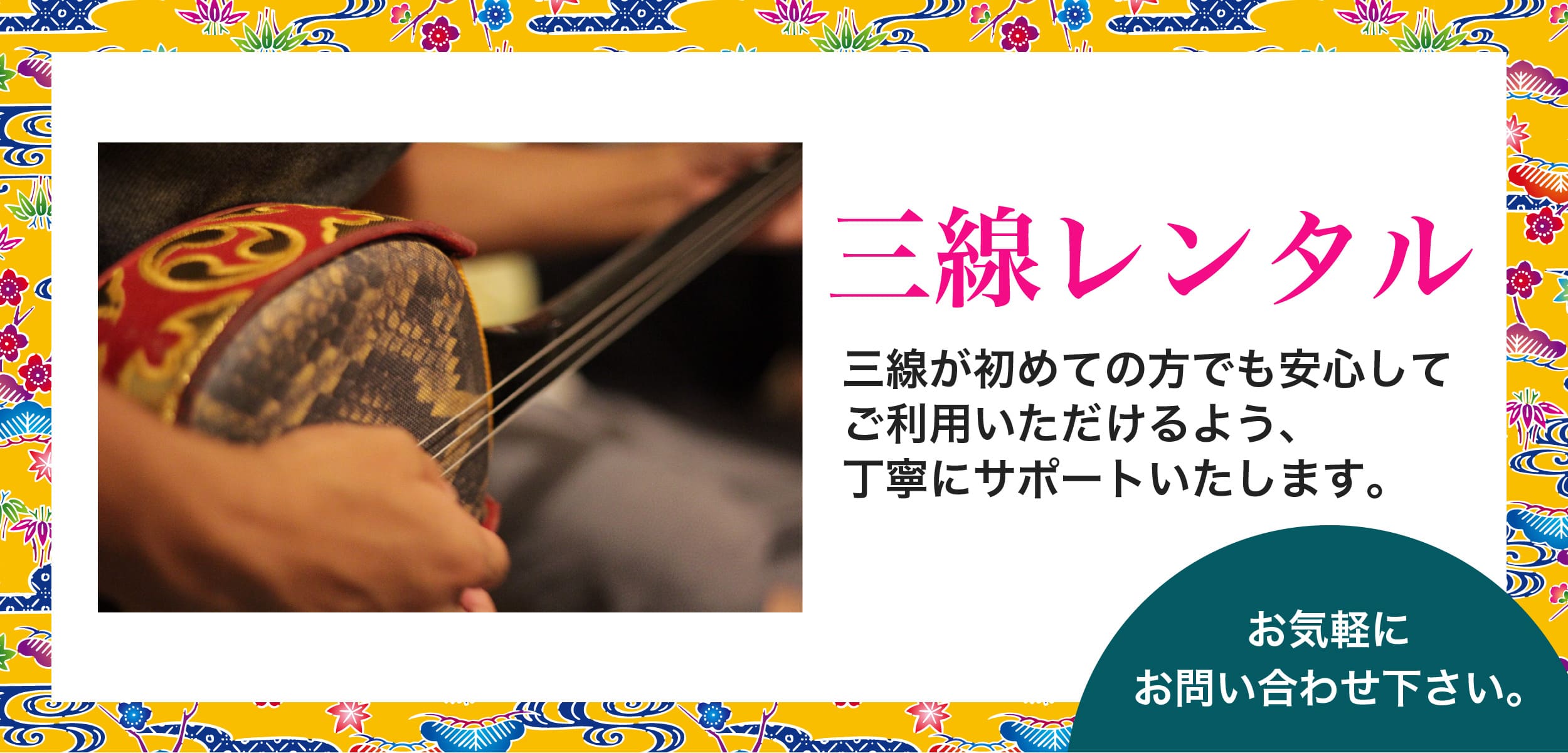 三線を気軽に楽しめるレンタルサービス。旅行中や初心者の方でも、手軽に本格的な三線を体験できます。